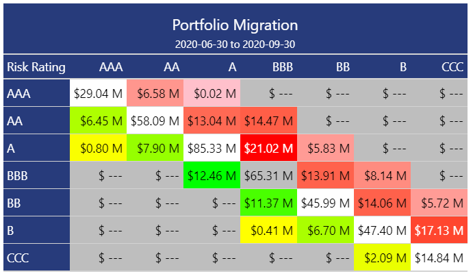 {migrate} provides an easy way to calculate absolute or percentage migration within a credit portfolio. The above image shows a typical credit migration matrix using the absolute approach; each cell in the grid represents the total balance in the portfolio at 2020-06-30 that started at the Risk Rating represented on the left-hand vertical axis and ended (at 2020-09-30) at the Risk Rating represented on the upper horizontal axis of the matrix. For example, $6.58M moved from a Risk Rating AAA at 2020-06-30 to a Risk Rating AA at 2020-09-30.